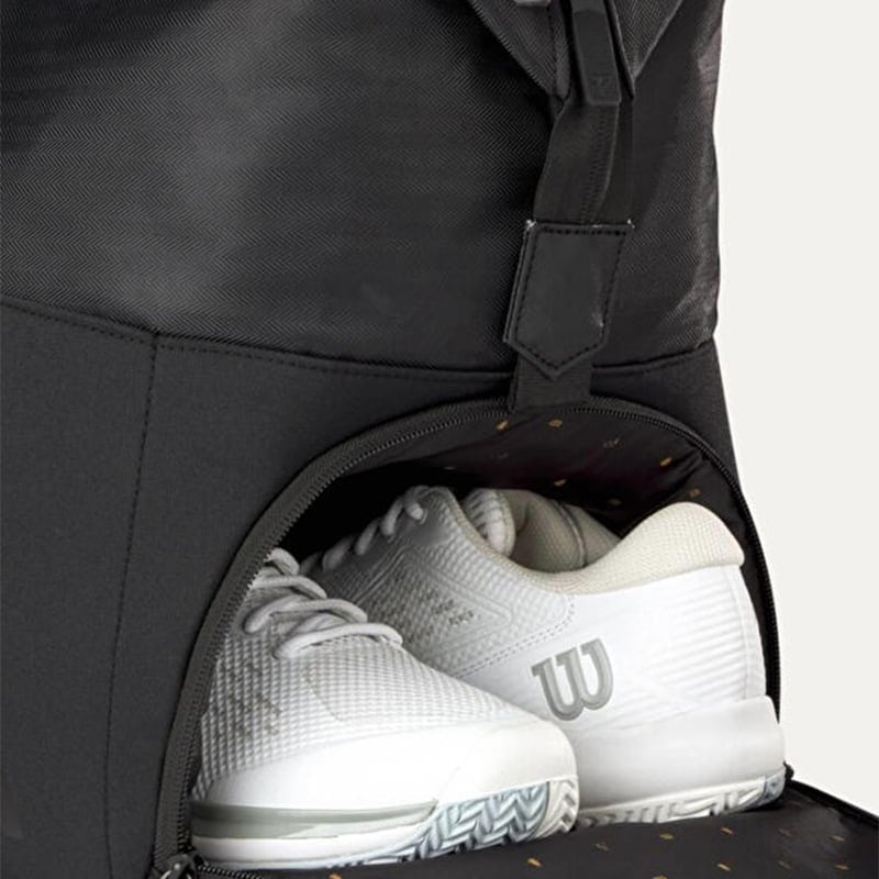Çantanın yan ve ön ceplerinde yer alan ek saklama alanları; kişisel eşyalar, aksesuarlar, havlular ve içecek şişeleri için pratik çözümler sunar. Alt bölümde bulunan ayrı ayakkabı bölmesi, ayakkabılarınızı diğer ekipmanlardan izole ederek hijyenik bir kullanım sağlar. Bu detay, profesyonel oyuncuların turnuva standartlarını karşılayacak şekilde düşünülmüştür.